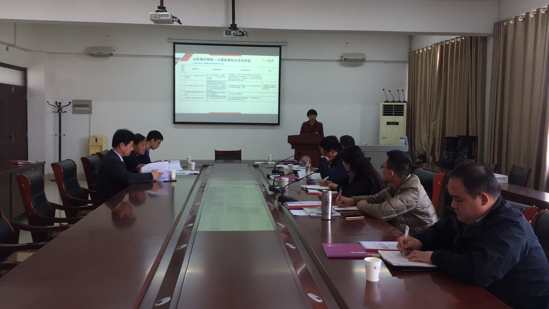 经过一番交流问候后大会正式开始,华主任就我校基本情况与各企业合作方案做出说明。北京大爱幼教集团首先对该公司与本校学前教育专业共建合作议程进行汇报,我校领导与该公司展开深刻讨论。北京大爱思想教育科技研究院,是国内专注于幼教领域民间社会智库,是民族立场下的中国式幼儿园。仲主任指出要把教育教学事宜放在第一位。