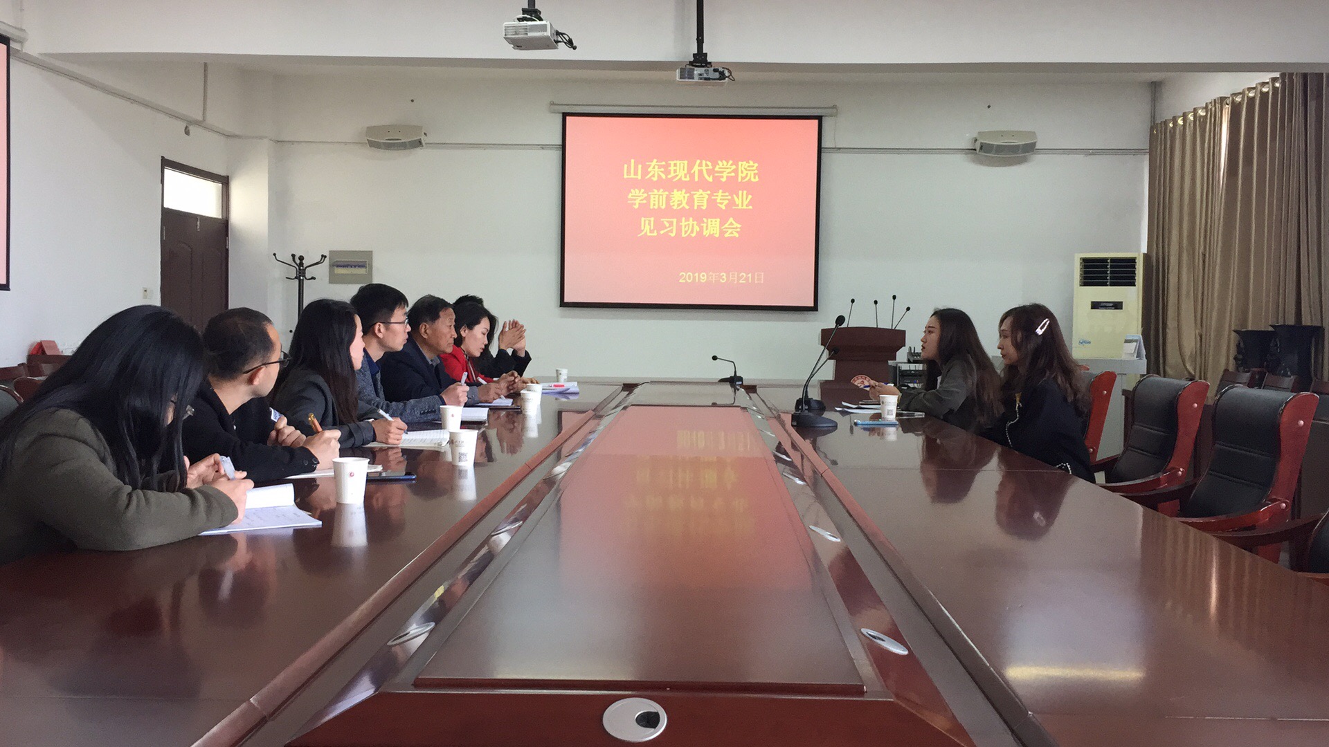 华主任首先代表我院对两位经理到来表示热烈欢迎。岳院长对学院学前教育专业学生基本情况做出说明。随后邓经理对公司基本状况、可供学生见习岗位等事宜一一介绍。