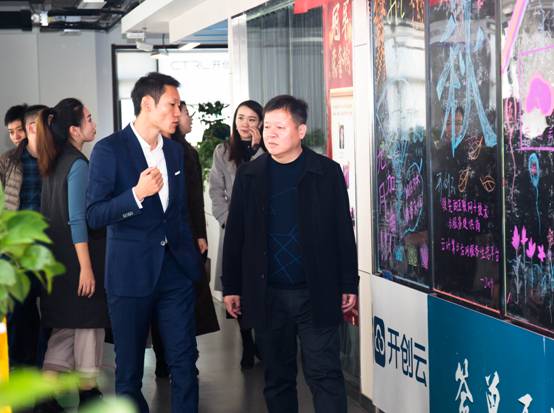 房董事长陪同现代学院嘉宾一同参观了集团办公区域和孵化器区域。开创集团旗下有开创云采购、曹操送、指动生活、微呼百应、开创影视、众创社群、企投社群等多个知名品牌。隶属于开创集团的开创信息目前已与省内包括山东理工大学、济南大学、齐鲁师范学院、潍坊科技学院、山东财经大学燕山学院、山东商业职业技术学院等多家高校开展产教融合等合作。